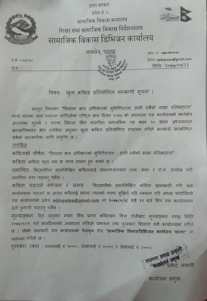 सामाजिक विकास डिभिजन कार्यालय, तानसेन, पाल्पाद्वारा बाल दिवसको अवसरमा आयोजना गरिएको खुला कविता प्रतियोगितामा सहभागी हुन इच्छुकले तलको सूचना अनुरुप "विपदमा बाल अधिकारको सुनिश्चितता, हामी सबैको साझा प्रतिवद्दता" शीर्षकमा कविता लेखि विद्यालयमा सम्पर्क गर्नुहुन अनुरोध छ।