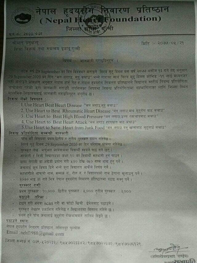 नेपाल हृदयरोग निवारण प्रतिष्ठान, पुल्चोक, ललितपुरको सूचना अनुसार विश्व मुटु दिवसको उपलक्ष्यमा निम्न विषयहरुमा लेखन कार्यक्रम आयोजना गर्ने भएकोले कक्षा १० का विद्यार्थीहरुलाई सूचित गरिन्छ ।