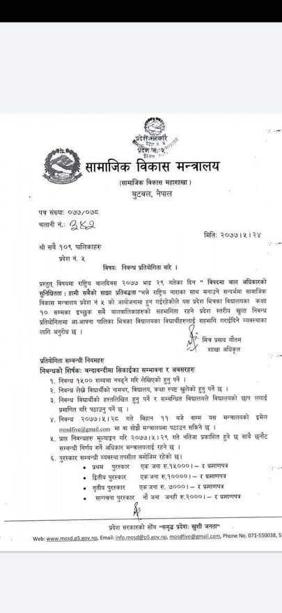 राष्ट्रिय बाल दिवस २०७७ को अवसरमा सामजिक विकास मन्त्रालय, प्रदेश नं. ५ ले "बन्दाबन्दीमा सिकाईका सम्भावना र अवसरहरु" शीर्षकमा कक्षा १० का विद्यार्थीहरु बीच प्रदेश स्तरीय खुला निबन्ध प्रतियोगिता आयोजना गरेको हुनाले ईच्छुक विद्यार्थीहरुले संलग्न गरिएको सूचना अनुसार निबन्ध लेखी विद्यालयमा सम्पर्क गर्नुहुन अनुरोध छ।