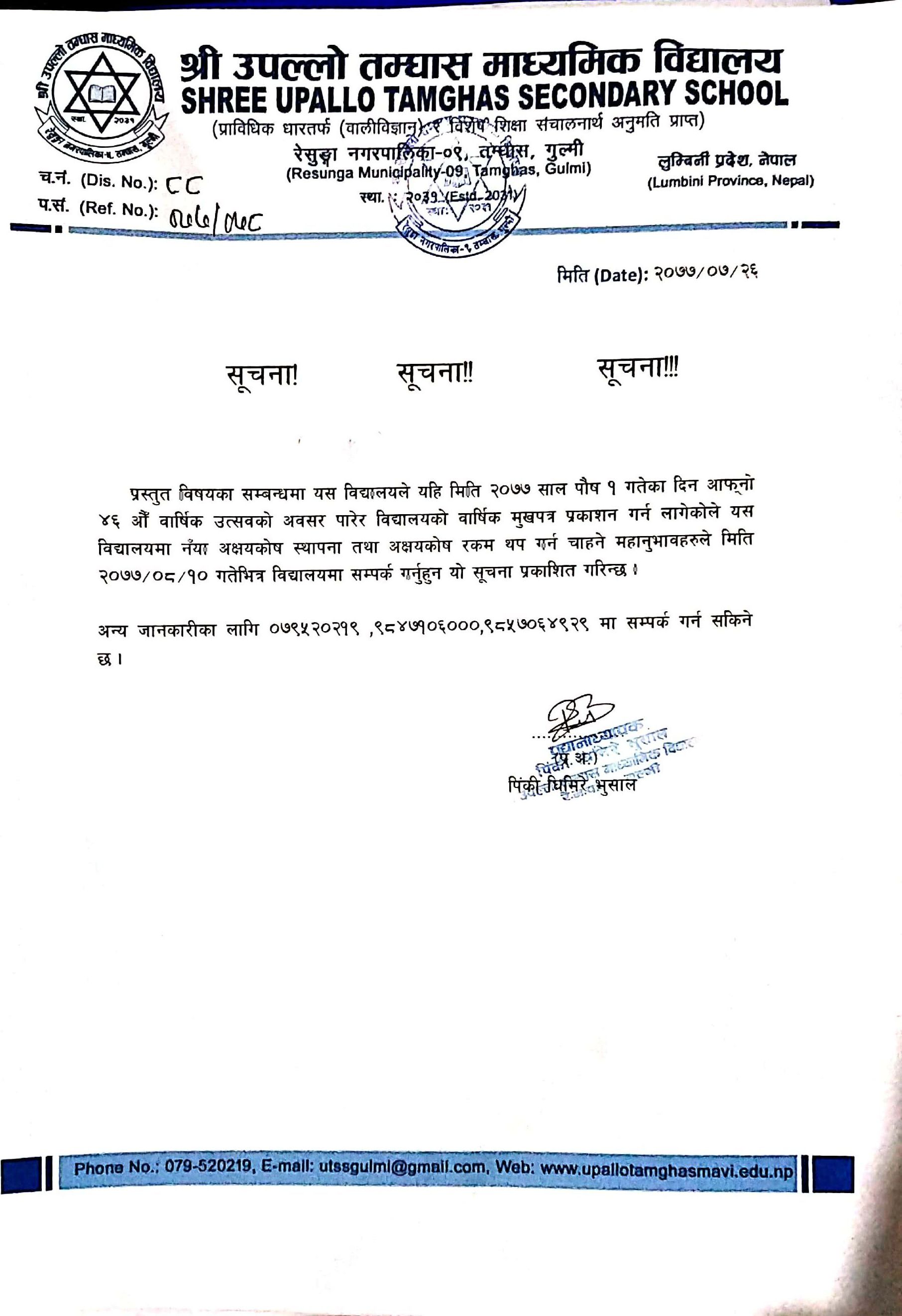 यस विद्यालयले आफ्नो ४६ औँ वार्षिक उत्सव पारेर विद्यालयको वार्षिक मुखपत्र प्रकाशन गर्ने भएकोले तपशिल अनुसारको सूचना प्रकाशन गरिएको छ।